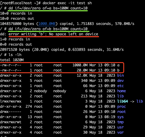 进入容器内,测试大文件对容器磁盘的占用限制: